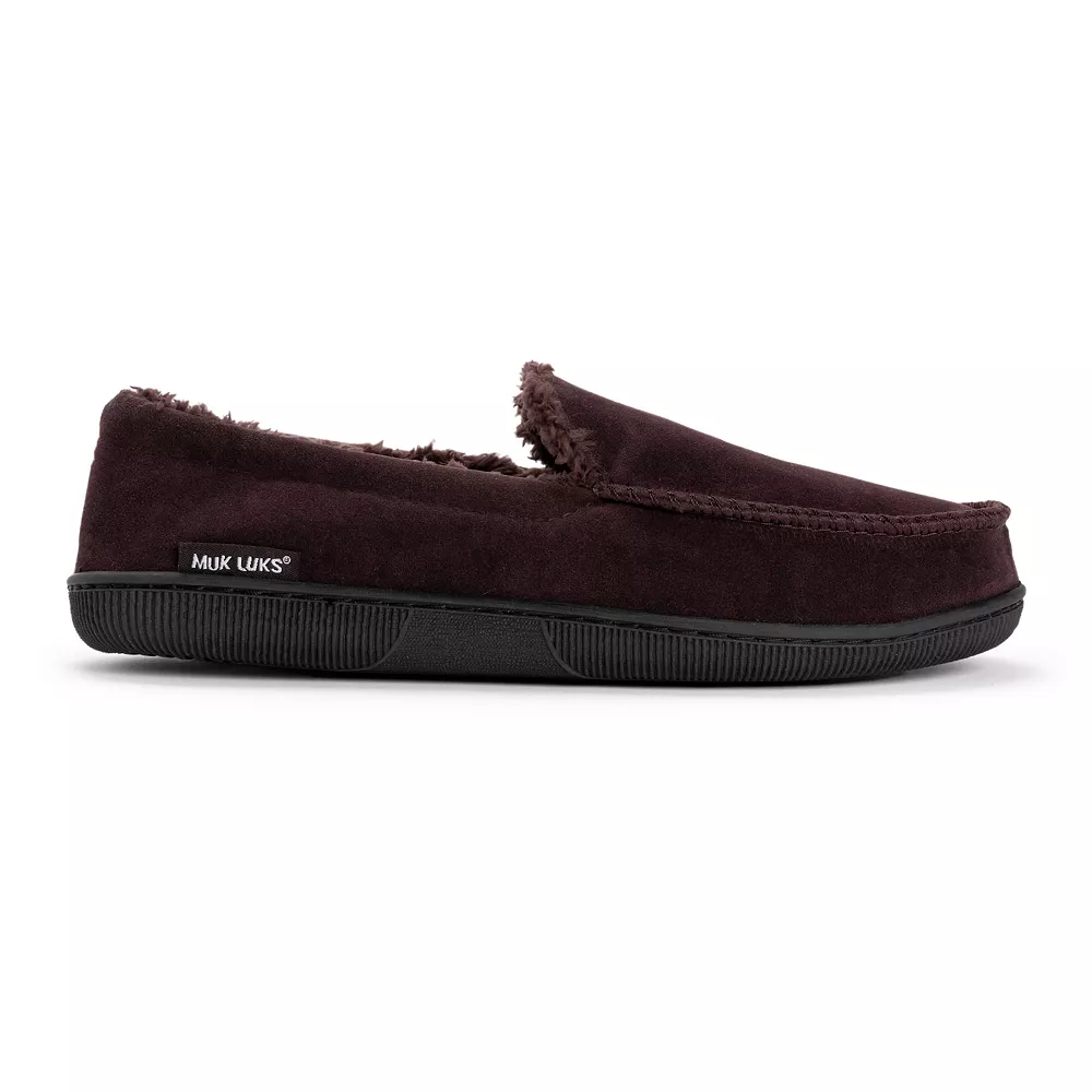 Kick back in easygoing MUK LUKS Eric Printed Berber Suede Slip-Ons! A comfortable foam insole, warm faux fur lining, and classic moccasin shape allow feet to relax in style. Featuring a durable indoor/outdoor sole, so these slippers can go everywhere you go.